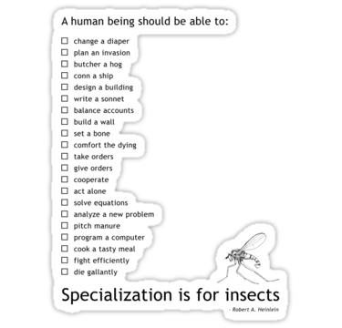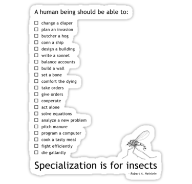 “A human being should be able to change a diaper, plan an invasion, butcher a hog, conn a ship, design a building, write a sonnet, balance accounts, build a wall, set a bone, comfort the dying, take orders, give orders, cooperate, act alone, solve equations, analyze a new problem, pitch manure, program a computer, cook a tasty meal, fight efficiently, and die gallantly.